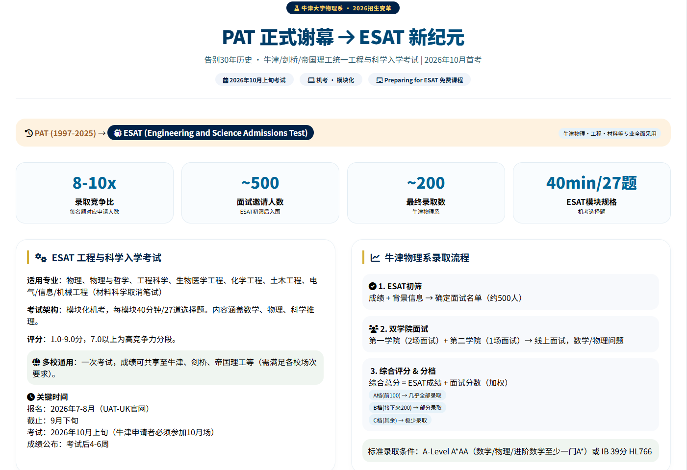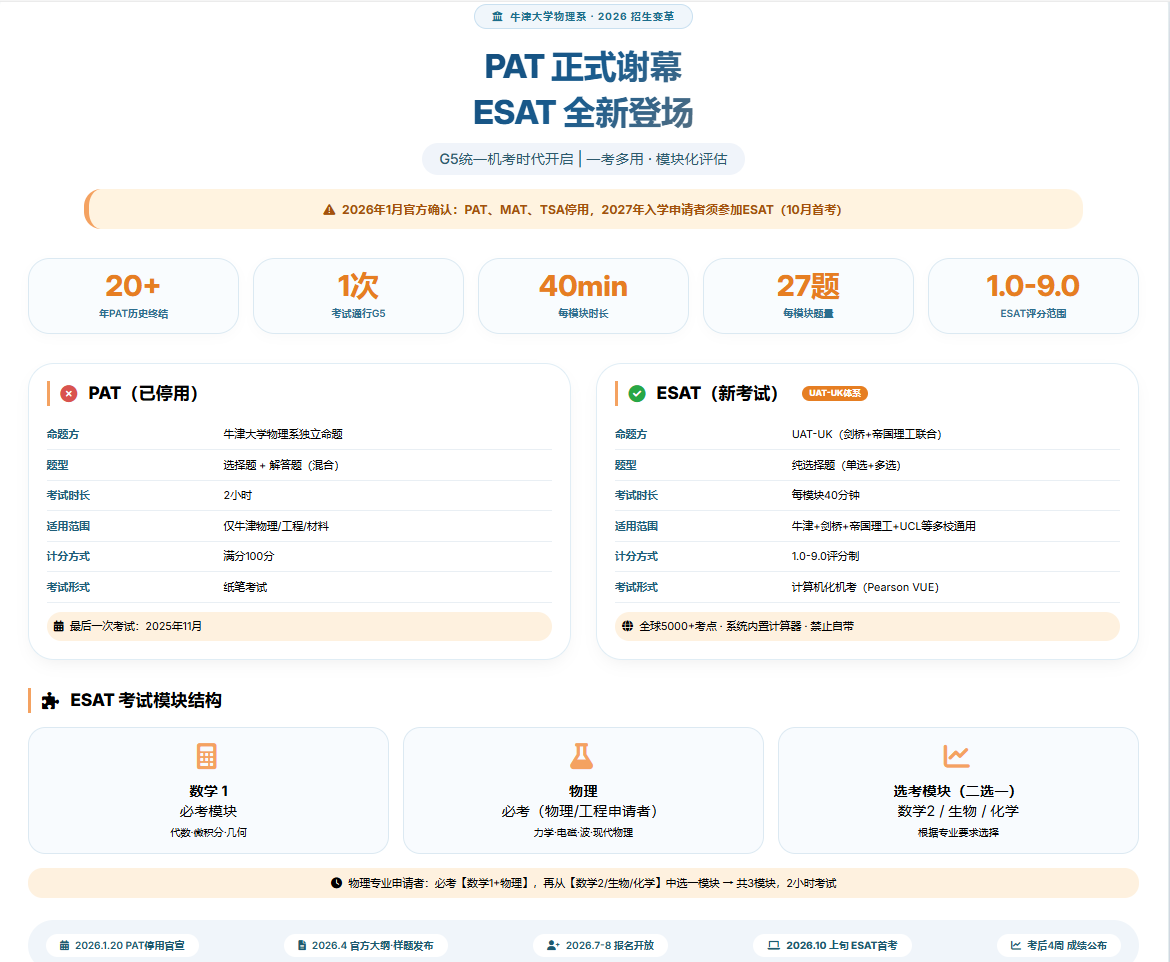 这意味着,自1997年首次实施以来服务了近30年的PAT考试,将在2026年正式告别历史舞台。所有计划申请牛津大学物理、物理与哲学、工程科学、材料科学等专业的申请者,将不再参加PAT考试,转而参加全新的ESAT(Engineering and Science Admissions Test,工程与科学入学考试)。