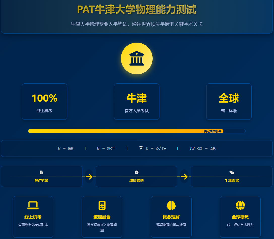 新申请季的挑战已经开启,对于那些梦想在牛津大学探索物理奥秘的学子而言,精心准备PAT,就是为你通往世界顶尖学府的道路铺下最坚实的第一块基石。
