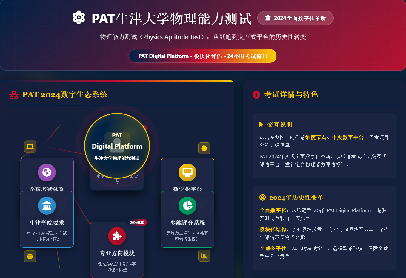 牛津大学物理系与考试委员会正式宣布,自2025年起,物理能力测试(Physics Aptitude Test,简称PAT)将全面转向数字化评估平台。这一历史性转变不仅是技术层面的升级,更是对物理能力评估理念的彻底重构。新的PAT Digital Platform将提供实时交互、自适应题目和多媒体资源集成功能。